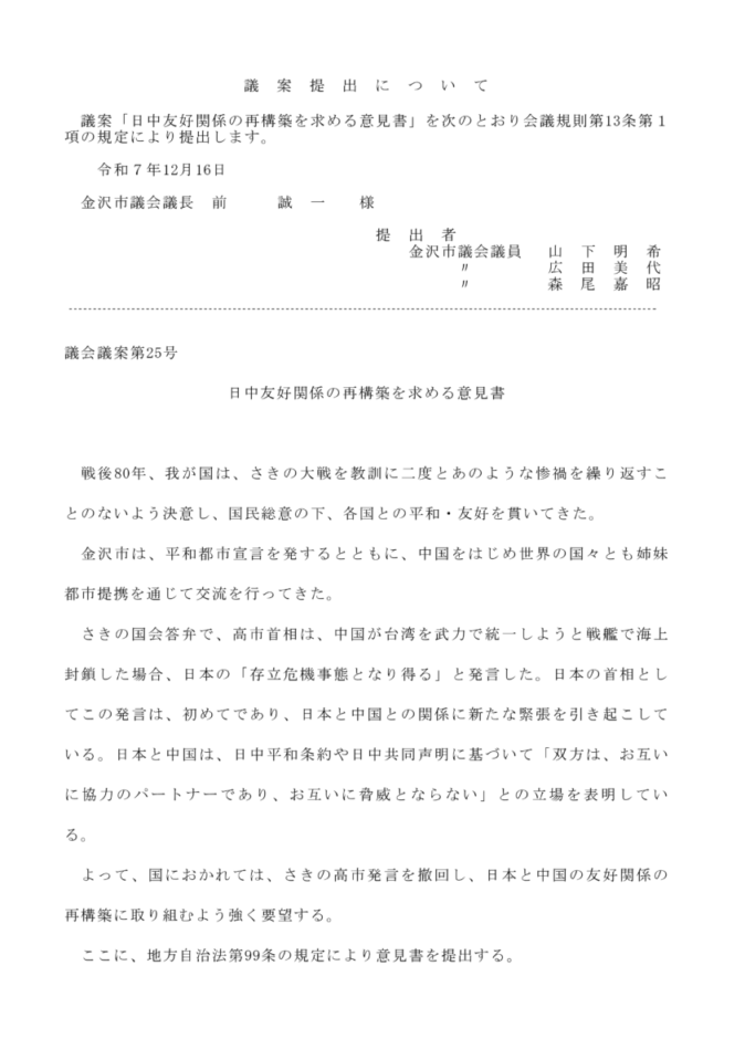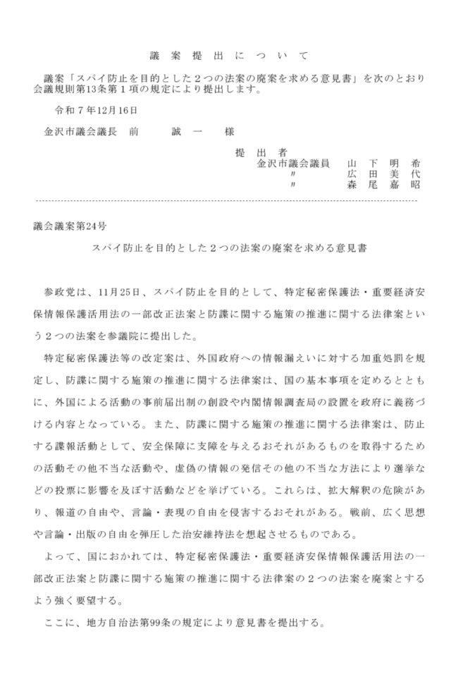 発言の機会を得ましたので、日本共産党金沢市議員団の一員として、議案第56号 令和7年度金沢市一般会計補正予算(第6号)、および議案第57号令和7年度金沢市水道事業特別会計補正予算(第2号)について質疑を行います。